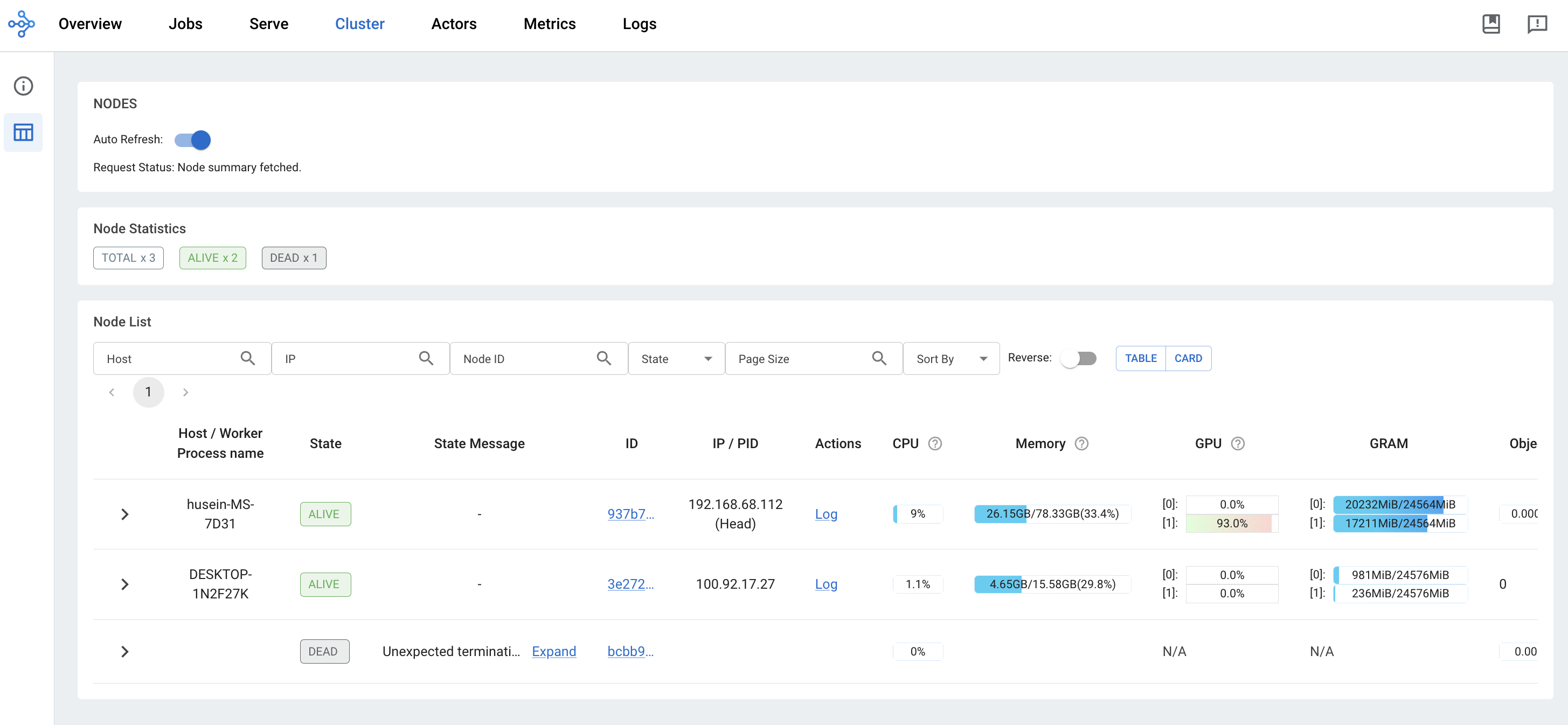 Also natively with Prometheus metrics (but we are not deployed it, too lazy), you can read more at https://www.anyscale.com/blog/monitoring-and-debugging-ray-workloads-ray-metrics, so when talk about Prometheus, you can setup real-time alerts to any channels that you want, for an example, GPU temp reached >80c so you can send alert to Slack.