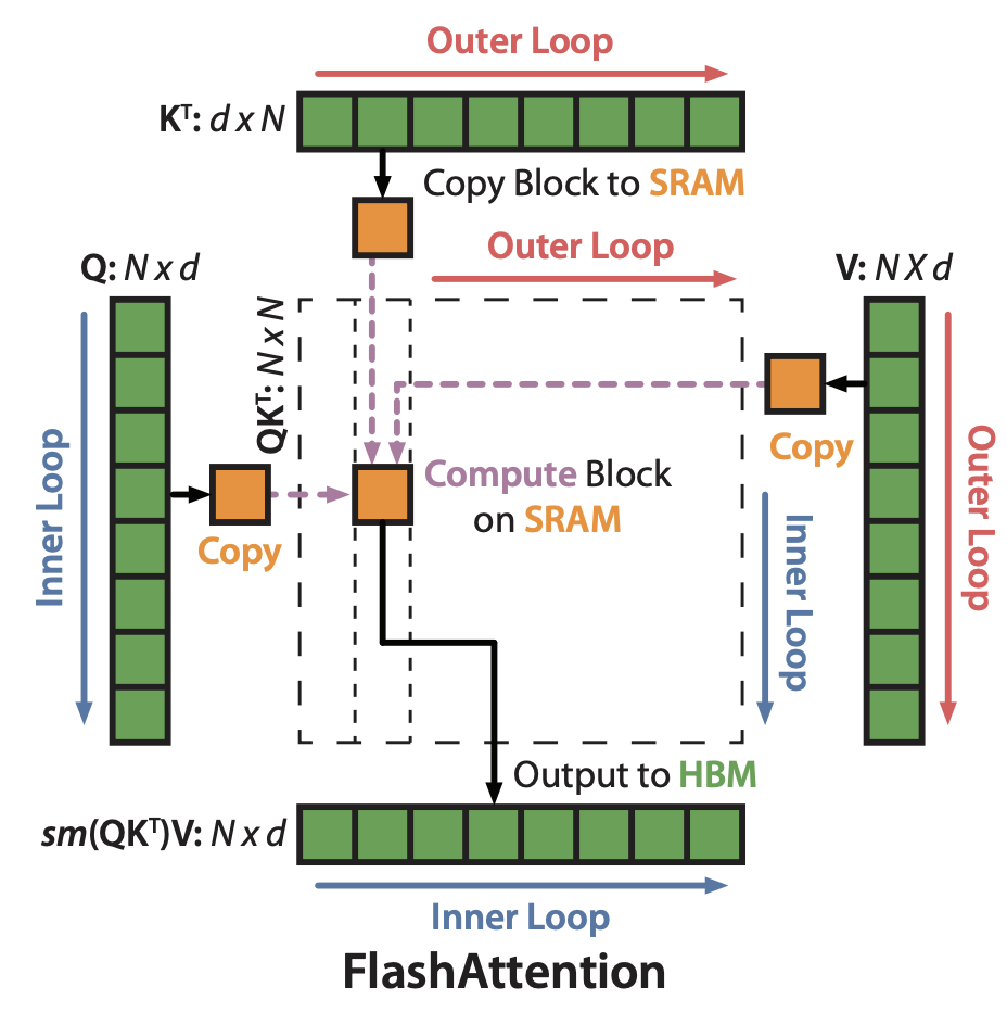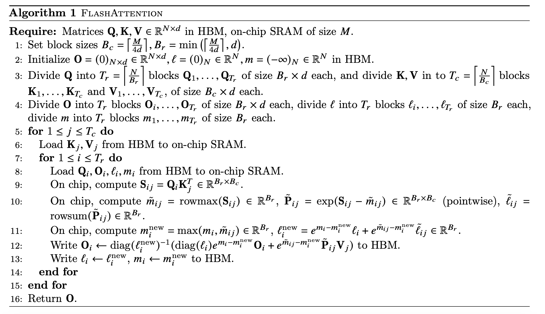 - As you can see there are outer and inner loops, defined as, loop for each KV blocks, nested loop for each Q blocks, and calculate local max and local attention, gather local max to get global max and for each local attention minus with global max to get the global attention.